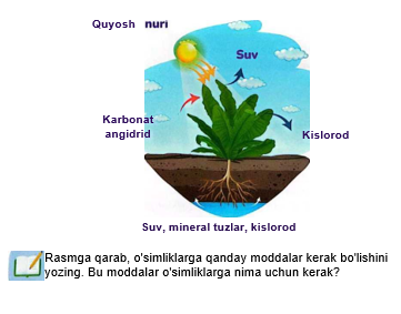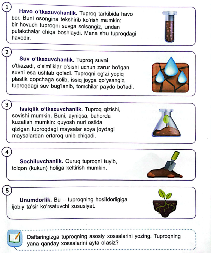 Tuproq jonli va jonsiz tabiatga tegishli jismlardan tashkil topgan. Tuproqning asosiy elementlari qum, loy, mineral tuzlar, chirindi, havo va suv kabilardir. Chirindi - bu o'simlik va jonzotlarning chirigan qoldiqlari. Tuproqda yashovchi mikroorganizmlar ularni qayta ishlab, mineral tuzlarga aylantiradi. 0‘simliklar ana shu mineral tuzlar bilan oziqlanadi. Ular ildizi orqali suvda erigan mineral tuzlarni so'rib oladi. Shuning uchun tuproqda chirindi qanchalik ko'p bo'lsa, u shunchalik unumdor bo'lib, o'simliklar gurkirab o'sadi.