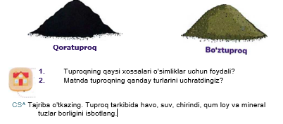 Tuproq namunalarini ko'rib chiqing. U nimalardan tarkib topganini ayting?