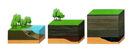 bir-birining ustiga taxlana borgan, keyinchalik ularning ustini qum yoki loy qoplagan. Yer ostida havo bo'lmaganligi sababli, ular suv bosimi ostida siqilib, asta-sekin ko‘mir qatlamiga aylangan.