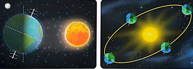 Rasmlarga qarab, kun va tunning, yil fasllarining almashinishini, Quyoshning chiqishi va botishini tushuntirib bering. Bunda sizga oldingi darsda yasalgan Yer maketi qanday yordam beradi?