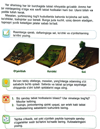 Zilzila, vulqon otilishi va sunami hodisalari Yer qobig'i ostidagi jarayonlarga bogliq bo'lsa, yomg'ir, do‘l va qor esa atmosferadagi jarayonlarga bog'liqdir
