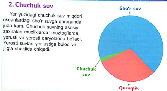 Qadimda ham, hozir ham odamlar ichish, taom tayyorlash va maishiy ehtiyojlar uchun, ekinlarni va uy hayontarini sug’orish uchun chuchuk suvdan foydalanadilar. Shu sababli odamlar qadimdan chuchuk suv manbalari - daryo va ko'llar atrofida yashashgan.