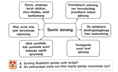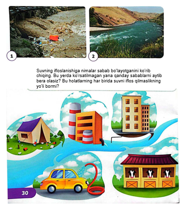 Suratlarga qarang. Qaysi daryo yoqasida yashashni xohlardingiz? Nima uchun suv havzalarini toza holda saqlash haqida qayg'urish kerakligini ayting